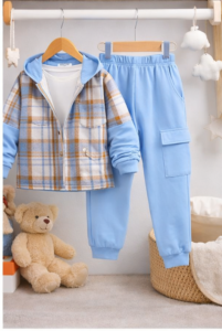 This stylish kids’ 3-piece outfit set includes a plaid hooded jacket, a comfortable white T-shirt, and matching cargo jogger pants. ...