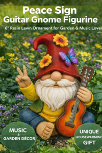 Peace Sign Garden Gnome Figurine – Funny Guitar Playing Outdoor Statue, 6’’ Resin Lawn Ornament