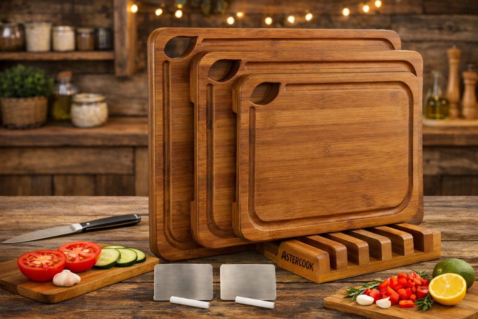 Astercook Deep-Carbonized Bamboo Cutting Boards Set with Stand – Reversible Kitchen & Charcuterie Boards