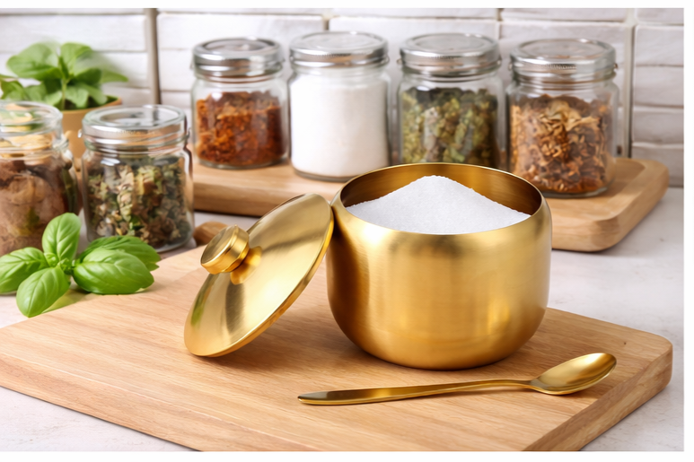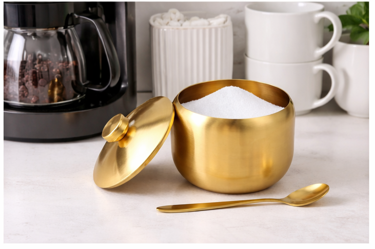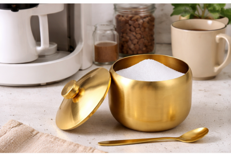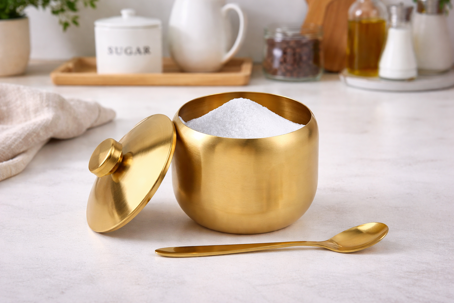 Elegant Kitchen Essential – Gold Sugar Bowl with Lid & Spoon (15oz)