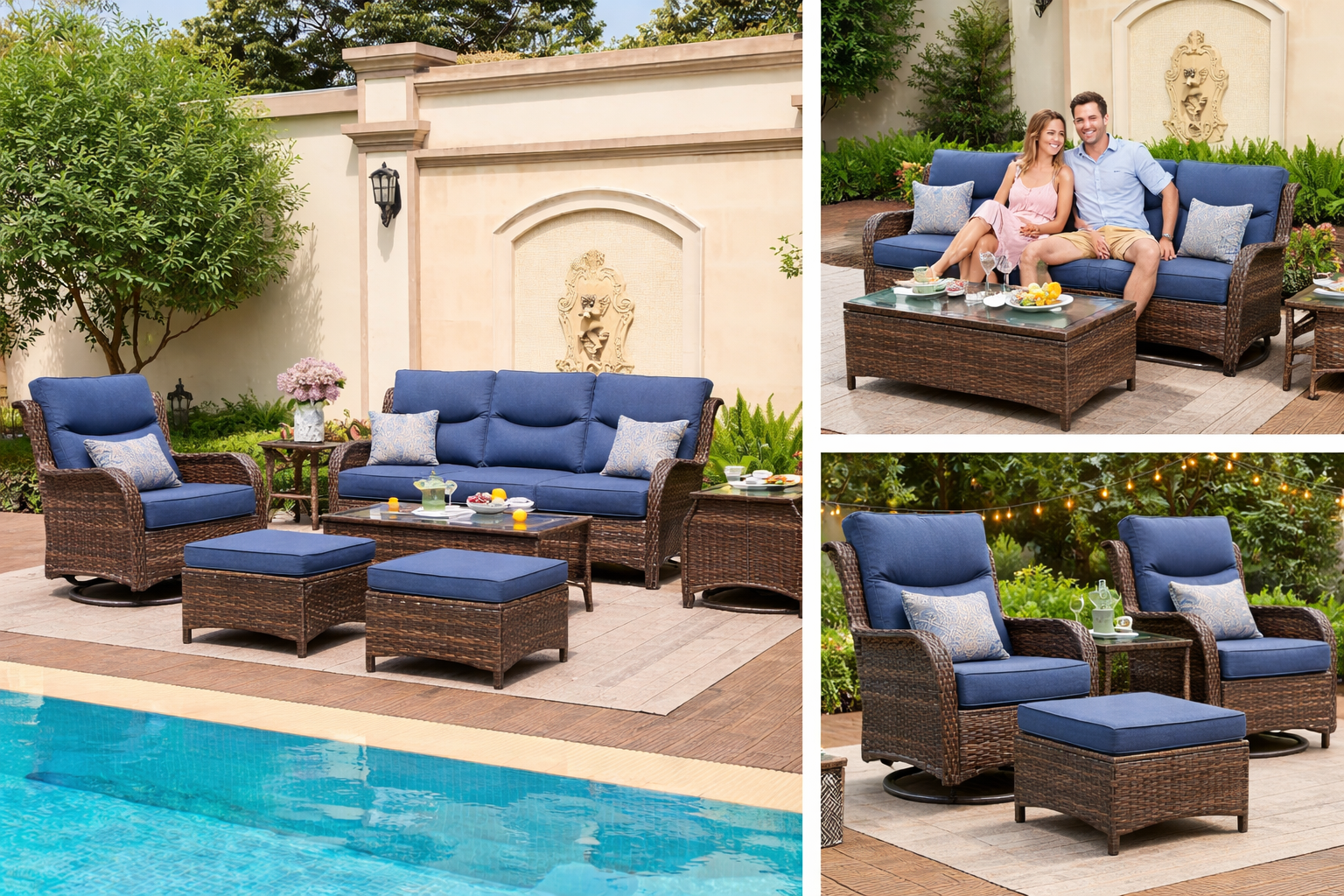 HILLGA Luxury Patio Furniture Set – 7-Piece Outdoor Wicker Conversation Set (Blue)