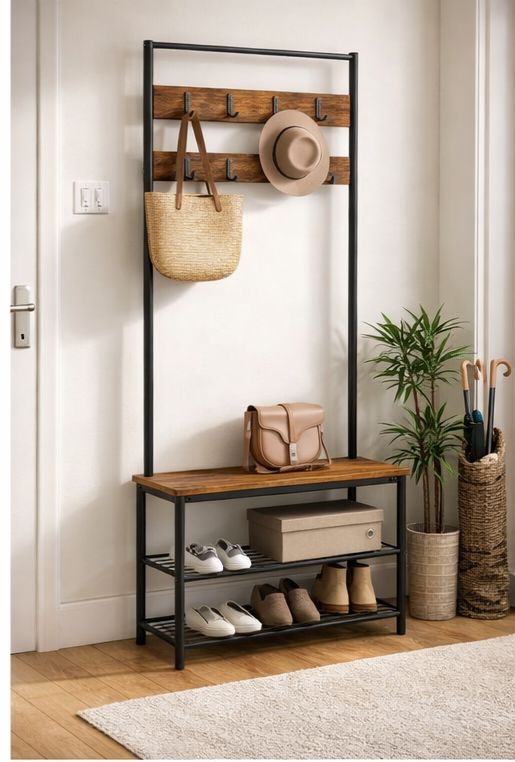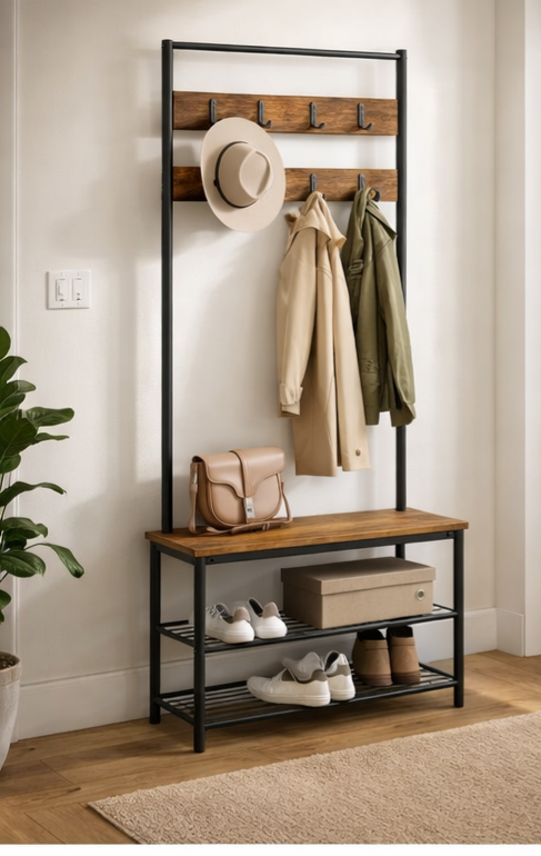 Industrial Hall Tree with Shoe Storage Bench – 3-in-1 Entryway Coat Rack