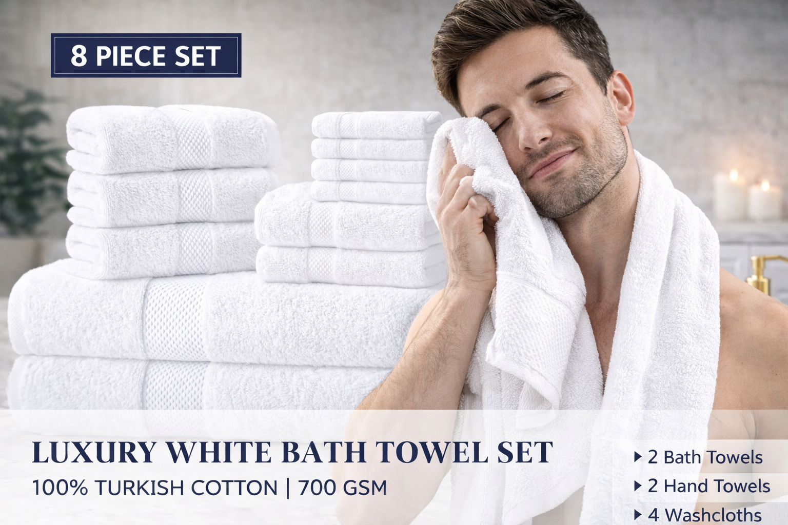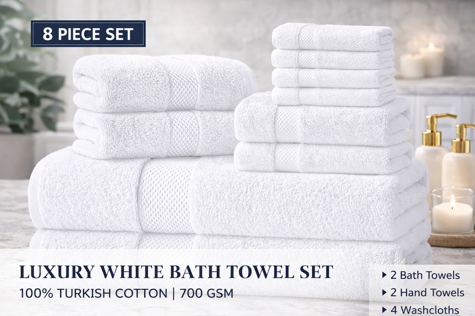 Luxury White Bath Towel Set – 8 Piece, 100% Turkish Cotton