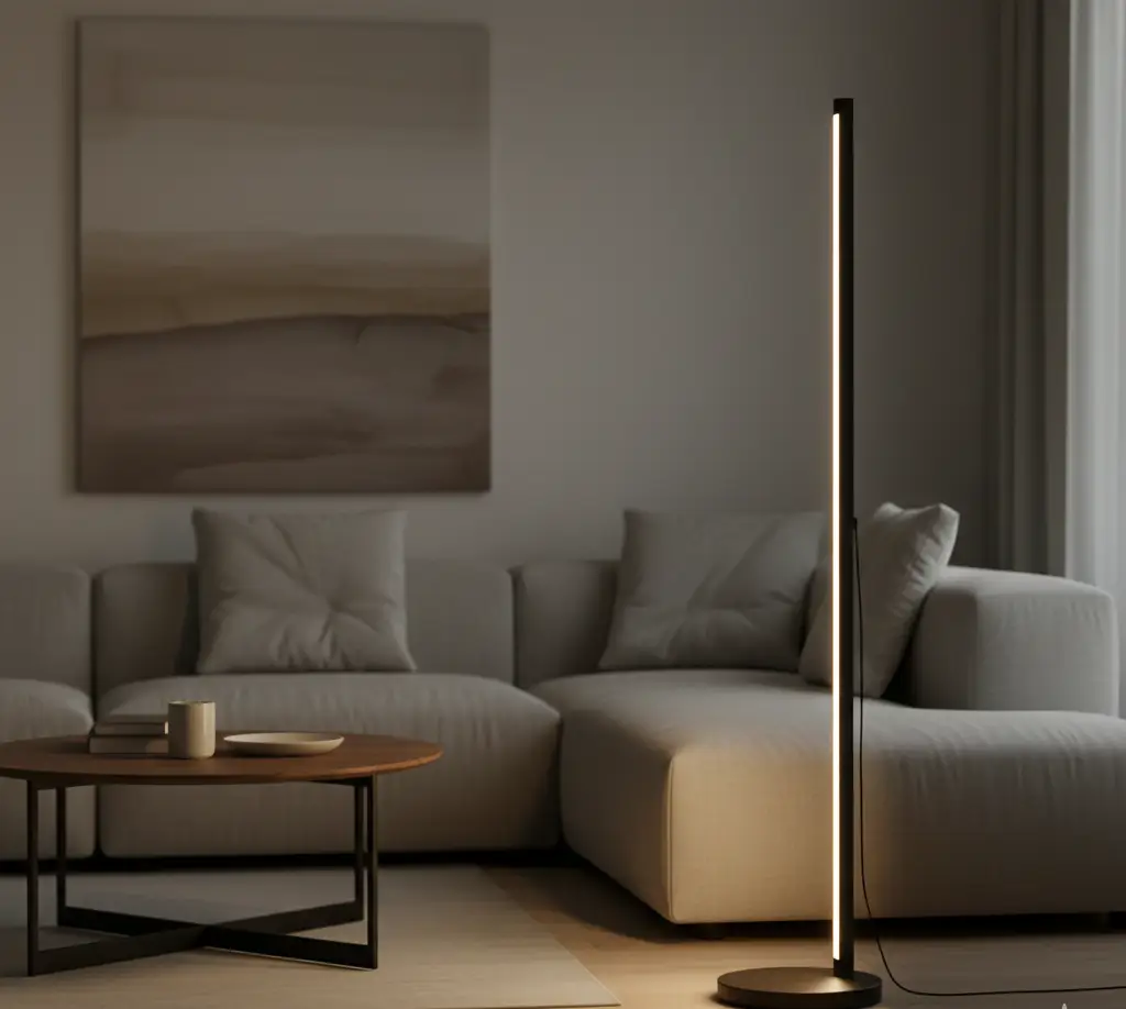 Stylish LED floor lamp for warm and modern living room lighting.