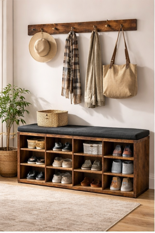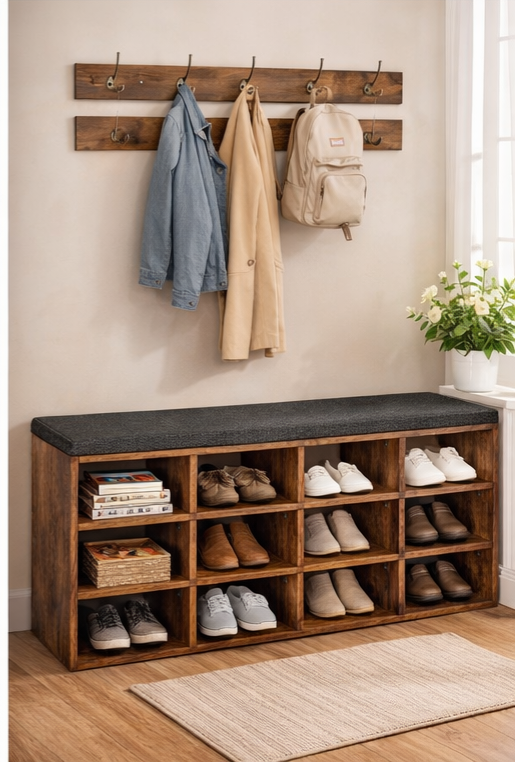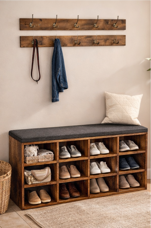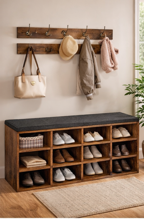Shoe Storage Bench with Cushion – Entryway Organizer with 12 Cubbies & Coat Hooks