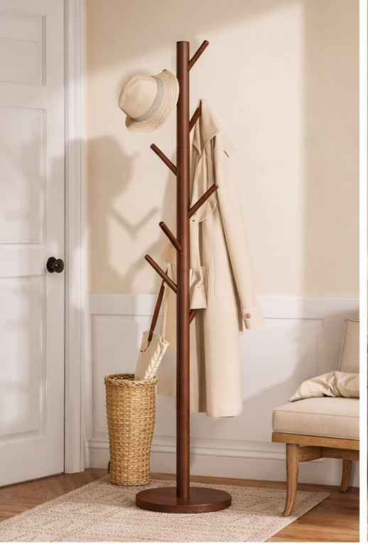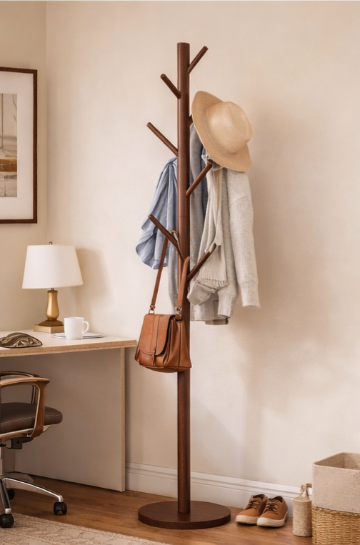 Wooden Coat Tree with 8 Hooks – Adjustable Standing Hat & Clothes Rack